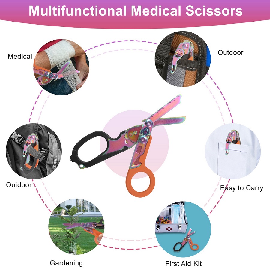 मेडिकल कैंची: प्राथमिक, उच्च प्रदर्शन वाली कैंची सीटबेल्ट, मोटी रस्सी और कपड़ों जैसी कठोर सामग्रियों को सटीकता से काटती है।
