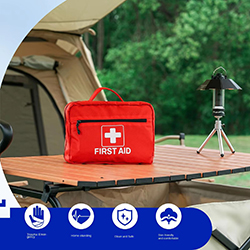 आपातकालीन वस्तुएँ: सीपीआर फेस शील्ड, आपातकालीन कंबल, प्राथमिक चिकित्सा गाइड