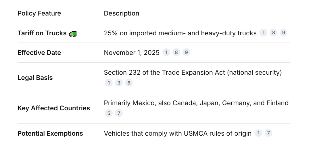 1.नीतिगत तर्क: यह टैरिफ अप्रैल 2025 में शुरू की गई धारा 232 जांच पर आधारित है, जिसने निष्कर्ष निकाला कि आयातित ट्रकों पर निर्भरता से अमेरिकी राष्ट्रीय सुरक्षा और घरेलू रसद श्रृंखला को खतरा है। लक्ष्य अमेरिकी निर्माताओं और नौकरियों की रक्षा करना है।
